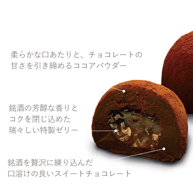 芋焼酎の王道「伊佐美」の持つ、奥深く芳醇な香りと、ふくよかな甘味をゼリーに仕立て、濃厚なチョコに優しく閉じ込め、ココアパウダーに包みました。
