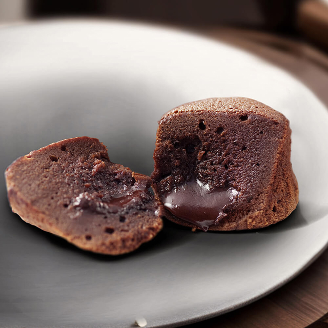 しっとりショコラ生地の中からソースがとろ~り♪電子レンジ(500w)で15~20秒ほど温めるとチョコレートソースが程よくとろけてデザート風にお楽しみいただけます。