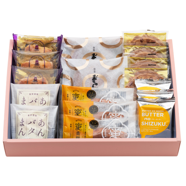 | 入数 | 17個入 [ボンディア 3個、南蛮どら 2個、ゆふいん創作菓子 蜜衛門 3個、バターのしずく 3個、あんバタまん 2個、豊後手焼煎餅 4枚] |