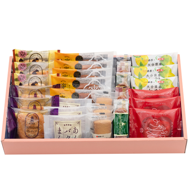 | 入数 | 29個入 【ボンディア 3個・ 蜜衛門 5個・栗のボンディア 3個・豆乳バターサンド 3個・ドン・フランシスコ[リンゴ3個、ブルーベリー3個]あんバタまん 3個・完熟かぼすボンディア3個・りんごかさね3個】 |
